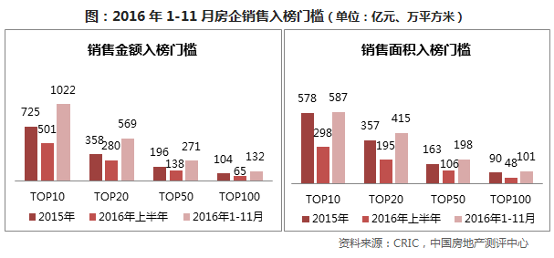 2016年1-11月,TOP100房企的入榜門檻持續(xù)提升。流量榜各梯隊房企的銷售金額、銷售面積門檻已超過2015年全年水平,其中TOP10房企保持強勁勢頭,金額門檻已過千億,超去年全年297 億元。預計全年銷售金額、銷售面積的入榜門檻仍將進一步提升。