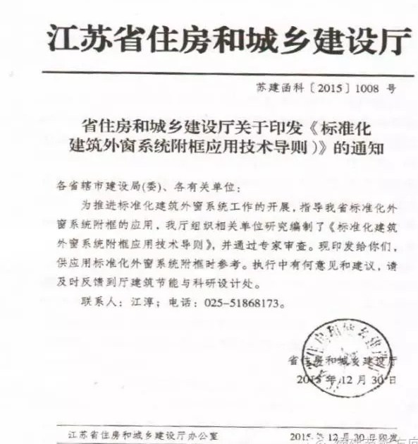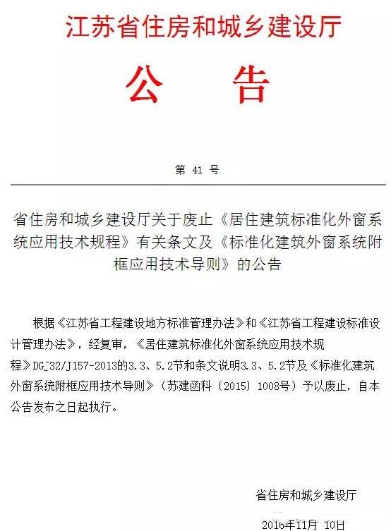 近期,江蘇省住建廳發(fā)布公告,廢除與標準化節(jié)能附框相關的強制規(guī)定要求。如下所示: