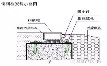 鋼附框是輔助門窗安裝的輔件,一般在斷橋鋁合金門窗、鋁包木門窗等產(chǎn)品類型中經(jīng)常可見,而對于塑鋼窗方案則較少采用附框的做法。相關的安裝節(jié)點如下所示: