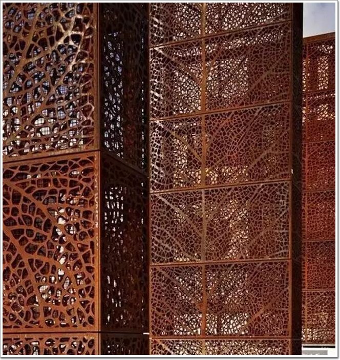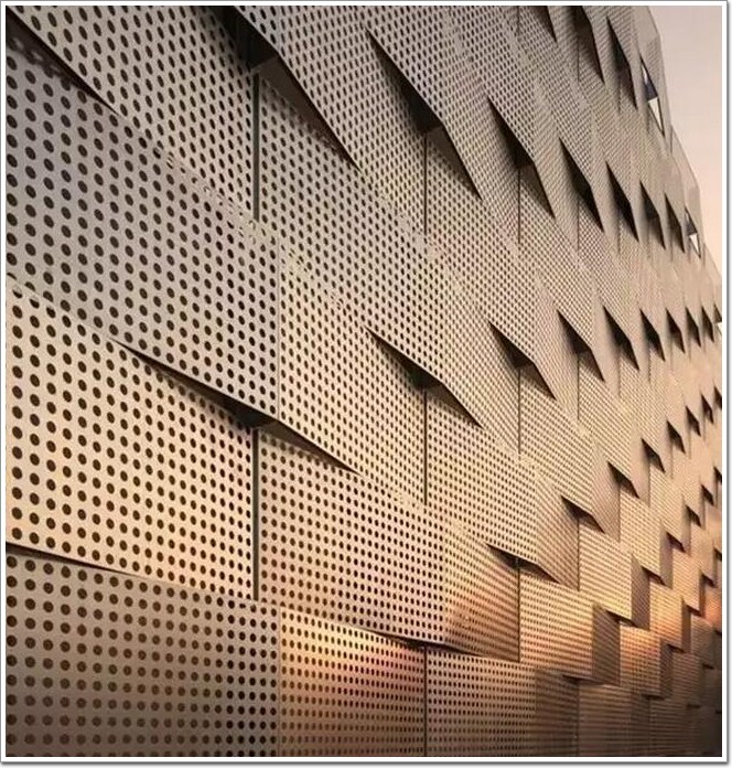 穿孔板由于材質的限制,所以孔型上,基本是圓孔、方孔、三角孔等簡單的幾何圖形。在現代生活中應用得非常廣泛,我們可以在工藝品、音響網罩等物品中看到它的身影。但更多時候它還是運用在建筑上,今天就帶大家一睹穿孔板在建筑中的運用吧~