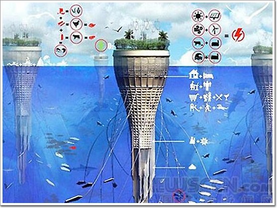 許多科學家曾經預言過,如果海平面持續上升,整個地球未來將成為一個水世界,我們人類將被迫放棄陸地,在水世界上重建家園。本圖所示的這個“游泳城市”似乎就是這樣一種思想的體現。這個“游泳城市”未來建筑設計方案是由安德拉斯-吉奧菲所創作,并在首屆“海洋替代設計大賽”中一舉奪魁。盡管在海洋上打造“游泳城市”可能要耗費巨額資金,但是它卻是未來基于海洋的人類社會建筑的一種模板。