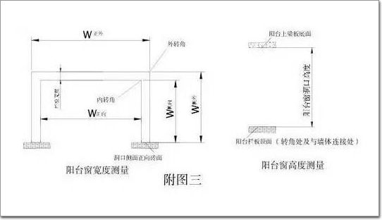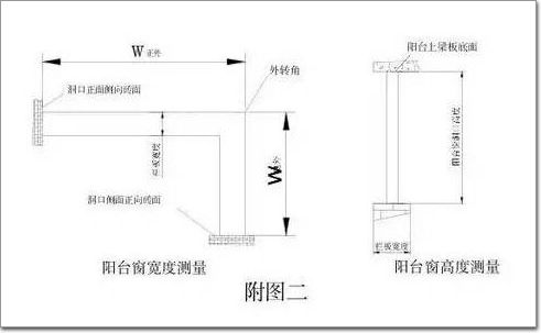 正面窗寬度測量:量出陽臺欄板頂面內(外)轉角處至洞口正面側向磚面間的距離,記為W正內(W正外)。