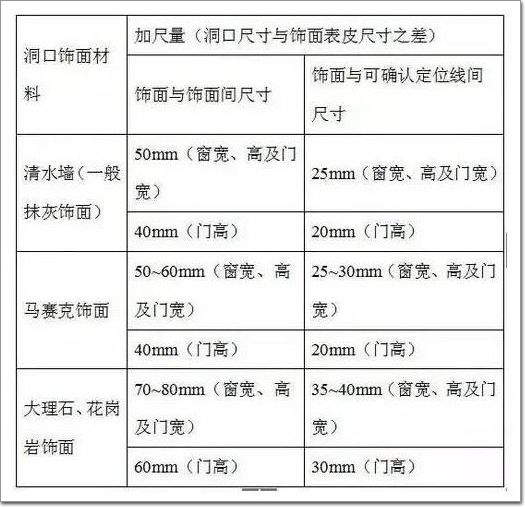 下表是幾種常見飾面材料的門窗加尺量,后面所述的常規加尺均按此進行。