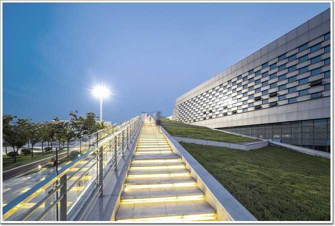 基地的四周為水系所環繞,設計因地制宜,采用堆山的方式,形成“三山兩河”的城市景觀。“三山”為綜合館,游泳館,體育培訓建筑三個體量, “兩河”為基地南北兩側的景觀水系。同時,通過覆土式的建筑處理,一方面體現了節能的理念,另一方面覆土屋頂花園為市民提供了生動有趣、可達性良好的城市活動空間。