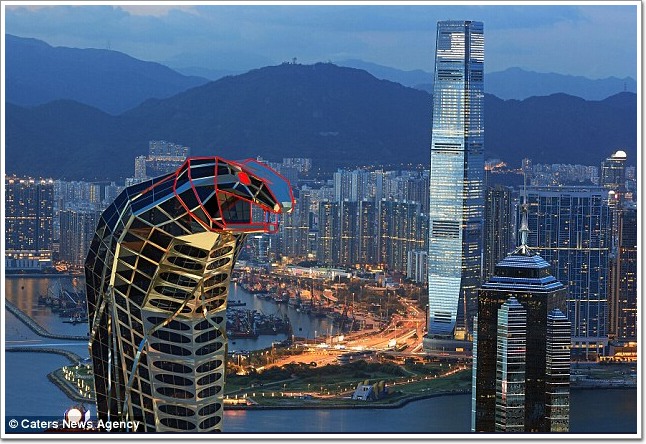 VasilyKlyukin在亞洲設計的眼鏡蛇大廈整體是進攻狀態的眼鏡蛇造型,內部計劃設有辦公設施與公寓,下顎部分則為餐廳或俱樂部,外部燈光可變色,猶如脫皮一般,個性而獨特,建成之后必將成為新的觀光景點。