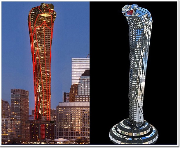 VasilyKlyukin在亞洲設計的眼鏡蛇大廈 “蛇背后鉆石狀的圖案代表了陰陽、二元對立和日月的統一,也代表了男性和女性,對立之物的融合,兩性的統一。”