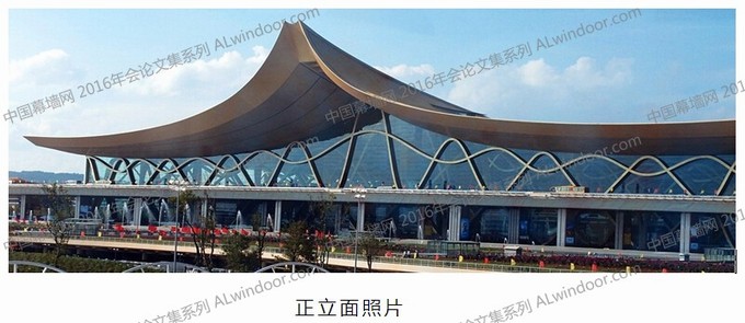 昆明長水國際機場南立面采用單索點支式玻璃和金黃色波浪形鋼結構彩帶渾為一體巧妙地組合成“金鑲玉”幕墻,建筑設計方案造型獨特。本工程幕墻采用了多項新技術,其節能環保、綠色建筑理念得到很好實現,獲得業主和專家論證好評。該工程已經獲得魯班獎和詹天佑工程大獎。因此一座具有云南民族特色的標志性航站樓宏偉建筑展現在世人面前。建成后北立面照片見下圖。