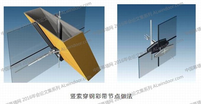 上圖中定滑輪固定在鋼彩帶預留的孔洞中,豎索穿過定滑輪,上下可以自由滑動,水平能傳遞荷載給鋼彩帶,定滑輪的摩擦系數非常小,能有效的防治豎索磨損。為了更有效的防治不銹鋼豎索磨損,定滑輪的兩個滑輪的材質采用的是比不銹鋼軟的鋁,這樣,即使有磨損,高預應力的不銹鋼絲也能得到保護。為了構造簡單及施工方便,橫索采用分段設計和施工。