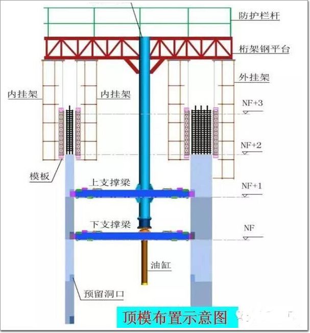 液壓頂升模板及平臺是通過低于已澆筑混凝土上的鋼梁作為受力構件,進行逐層頂升。