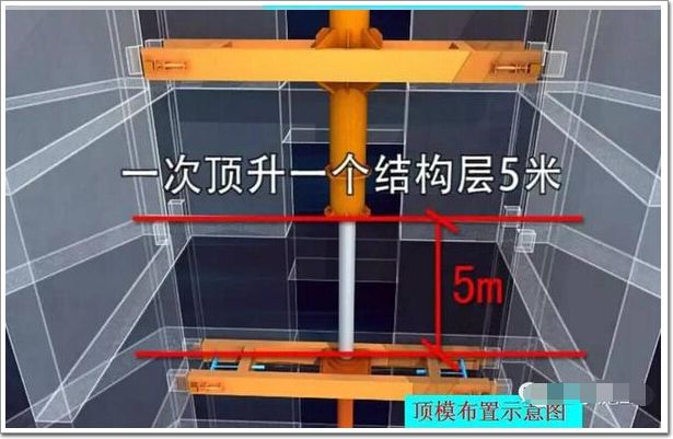 頂模是通過長行程、大噸位液壓雙作用油缸頂升體系,一個行程即可頂升一個結構層,在很短時間內即可完成全部頂升工序,加快施工速度。