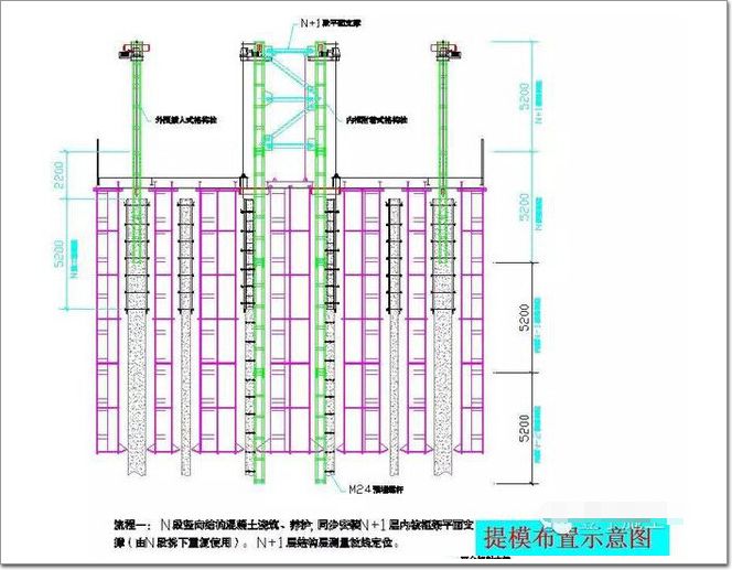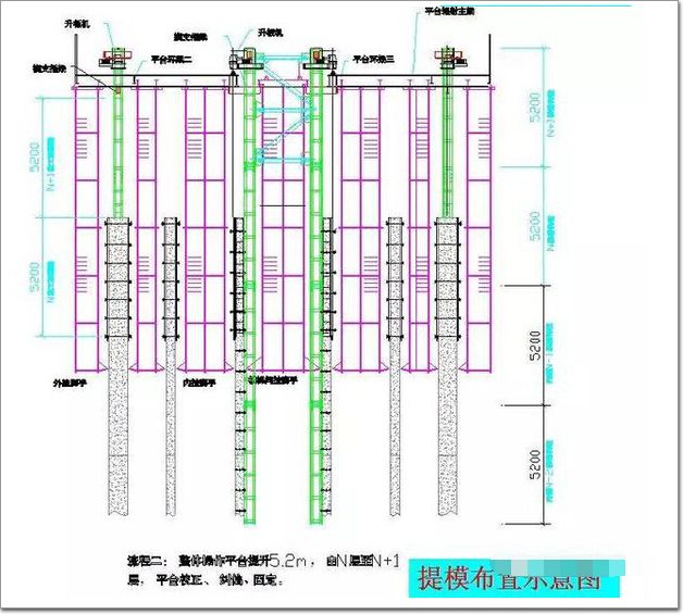 整體提升模板及平臺系統是通過高于已澆筑混凝土內的格構柱作為受力構件,進行逐層提升。