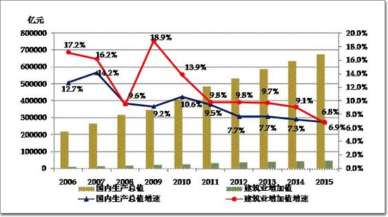 經初步核算,2015年全年國內生產總值676708億元,比上年增長6.9%。全年全社會建筑業實現增加值46456億元,比上年增長6.8%,增速低于國內生產總值增速0.1個百分點,自2009年以來首次低于國內生產總值增速(圖1)。