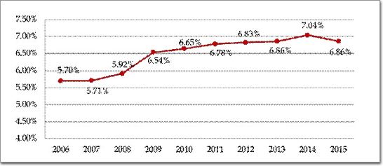 圖2 2006-2015年建筑業增加值占國內生產總值比重