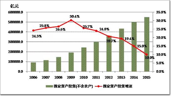 圖3 2006-2015年全社會固定資產投資(不含農戶)及增速