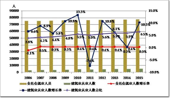 圖6 2006-2015年全社會就業人員總數、建筑業從業人數增長情況