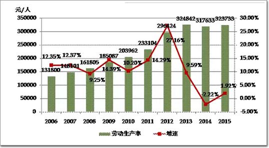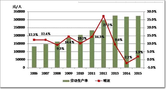 圖8 2006-2015年按建筑業總產值計算的建筑業勞動生產率及增速