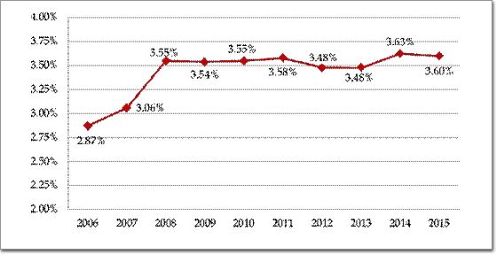 近10年來,建筑業產值利潤率(利潤總額與總產值之比)一直曲折徘徊在3.5%左右。2015年,建筑業產值利潤率在上年出現較大幅度上升的基礎上小幅下降,達到3.60%,比上年降低了0.03個百分點(圖10)。