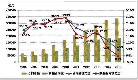 圖11 2006-2015年全國建筑業企業簽訂合同總額、新簽合同額及增速