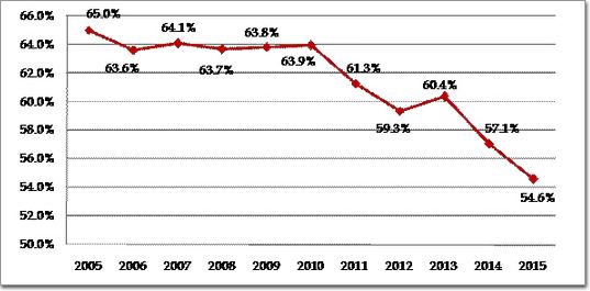 圖12 2006-2015年全國建筑業企業新簽合同額占合同總額比例