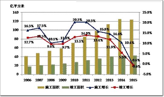 圖13 2006-2015年建筑業企業房屋施工面積、竣工面積及增速