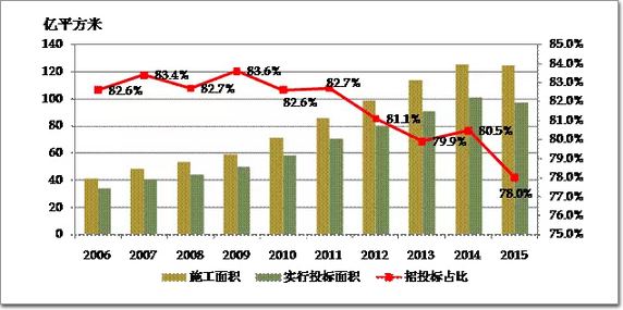 圖15 2005-2015年房屋施工面積、實行投標承包面積及其占比