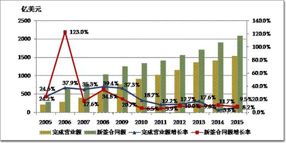 2015年,我國對外承包工程業務完成營業額1540.7億美元,增長8.2%,增速比上年提高4.4個百分點。新簽合同額2100.7億美元,增長9.5%,增速較上年下降了2.2個百分點(圖16)。