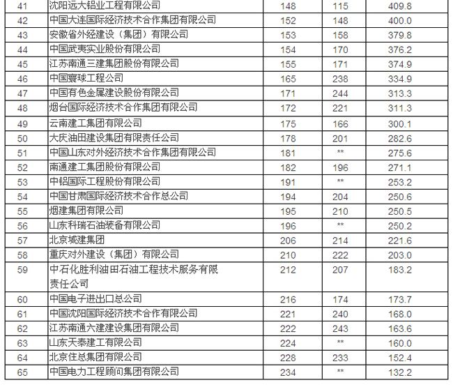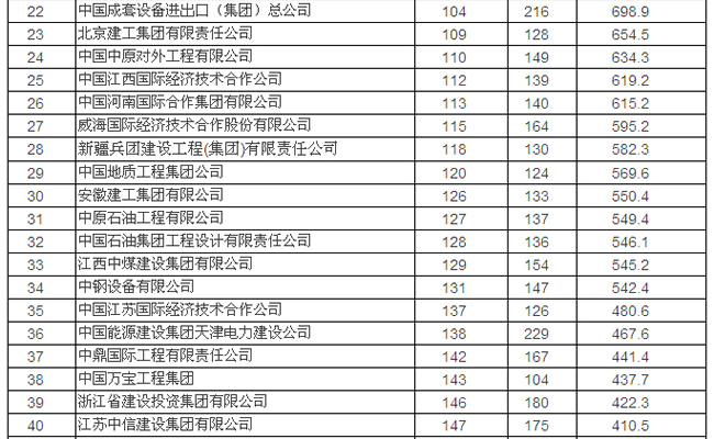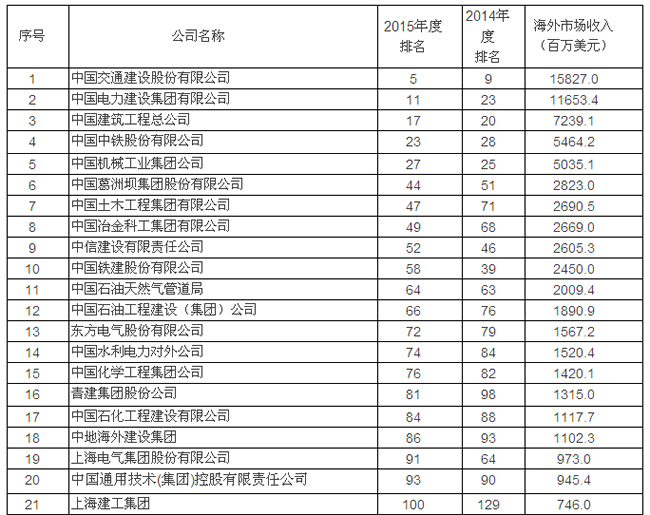 表1 2015年度ENR全球最大250家國際承包商中的中國內地企業