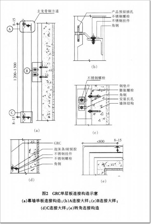 GRC單層板結構簡單,厚度一般為20~30mm。GRC單層板采用石材背栓連接方式,其連接構造如圖2所示。