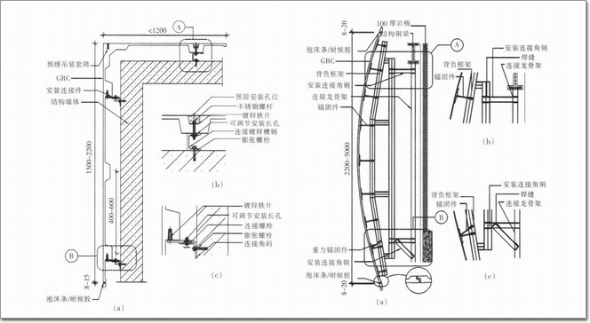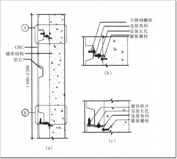 GRC構件本身內部加固用的鐵件采用自身預埋中8鋼筋,配帶50mmx30mmx3Bin鍍鋅方鋼,加固的鋼架采用鍍鋅角鋼(詞條“鍍鋅角鋼”由行業大百科提供)、鍍鋅方管。GRC構件之間、GFRC構件與結構墻體之間的縫隙填補需采用具有抗裂、防水功能的材料。體積密度不小于2.01 g/cm,;抗壓強度不小于60.5 MPa。抗彎極限強度:平均值不小于24.4 MPa;單塊最小值不小于23.5 MPa。抗拉強度不小于7.1MPa;抗沖擊強度不小于14.8 l(J/m;吸水率不大于10.0%;抗凍性:經25次凍融循環,無起層、剝落等破壞現象。