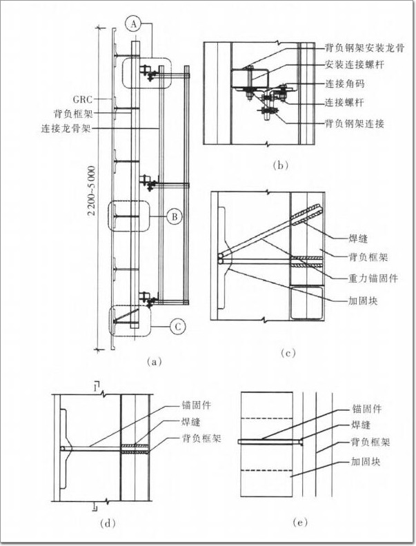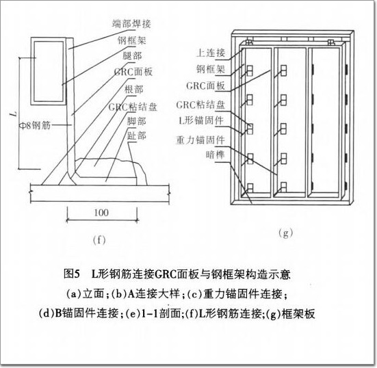 所以,就要保證傳遞重力荷載和風荷載的兩個接 觸點之間保留足夠的自由度。能夠允許這種變化。針對以上特征。GRC幕墻與建筑主體的連接系統既不同于玻璃幕墻的框架、支撐結構,也不同于石材的干掛 結構,而需設計一種連接系統,能夠傳遞GRC的風荷載、重力荷載,但又能夠降低連接點之間線性變化的約束。為了滿足以上情況,GRC幕墻特有的連接系統是:通過柔性的、不同形狀的錨固件連接GRC幕墻板材,錨固件連接在板框架上,通過板框架連接到建筑 主體上。GRC面板與鋼框架采用沿板左右對稱均布的L形 鋼筋連接,這是一種典型的柔性連接。其中L形鋼筋的腳部埋設在GRC面板內側表面,而其腿部上端焊接到鋼框架上,且趾部指向板的對稱軸線(圖5)。鋼筋的直徑為8mm,其有效作用長度滿足設計要求,埋設長度為100mm。用于埋設L形鋼筋腿部的粘結盤尺寸為100mmx200mm,厚度與板厚相等。為了支撐GRC面板的自重,通常應在板下部的全部或部分柔性連接點處增加斜向布置的L形重力錨固筋。重力錨固筋連接方式與L形柔性連接鋼筋的連接方式相同(圖6)。