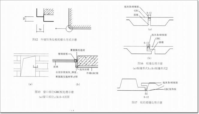 板縫處理如圖16所示;板的接縫處理如圖17所示:GRC板與玻璃的接縫處理如圖18所示;構造縫處做法如圖19所示。