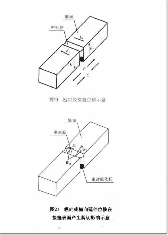 (1)在熱位移及其他影響因素的作用下,密封膠接縫會經歷4種基本的位移(圖20),即:壓縮C、延伸D、縱向延伸既和橫向延伸晶。縱向和橫向延伸對密封膠接縫產生剪切影響(圖21)。
