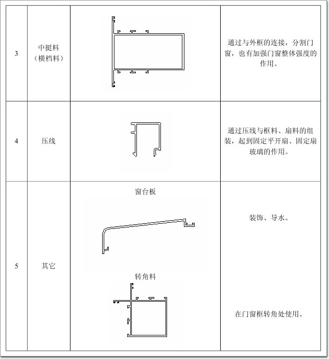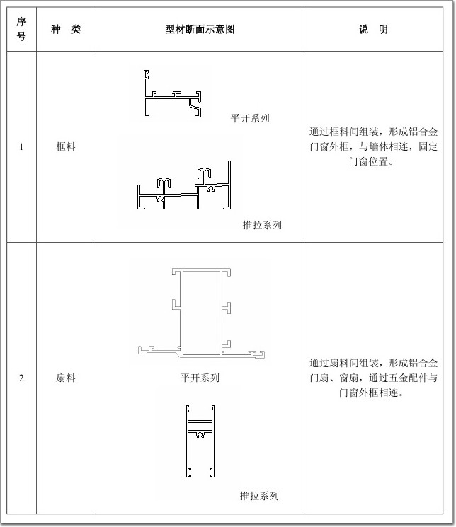 型材是鋁合金門窗的主要材料之一,是門窗的主要的組裝、受力構件。按鋁合金型材拼裝位置可分為框料、扇料、中挺料(橫檔料)、門窗壓線及其它鋁料這幾類,這幾類型材的具體區別可參照下表: