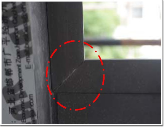 不合格表現:開啟框組角拼縫處:“斷面(詞條“斷面”由行業大百科提供)密封膠”缺失、且局部有“組角結構膠”殘留,拼縫密封質量不合格。