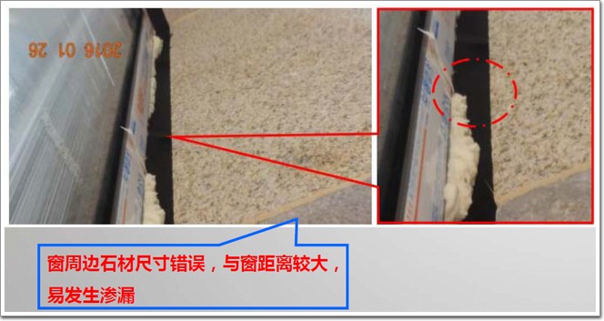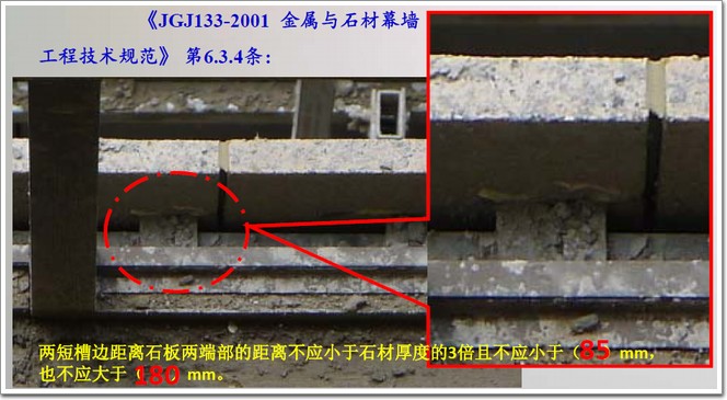 不合格表現:干掛槽口距石材端部距離不滿足規范要求。