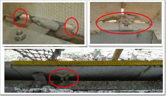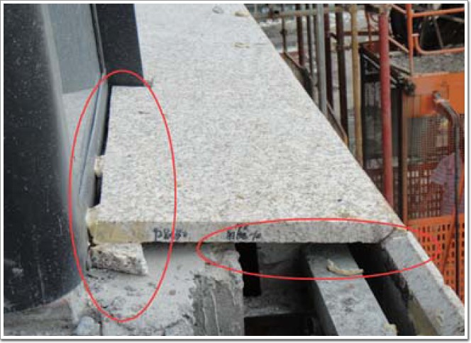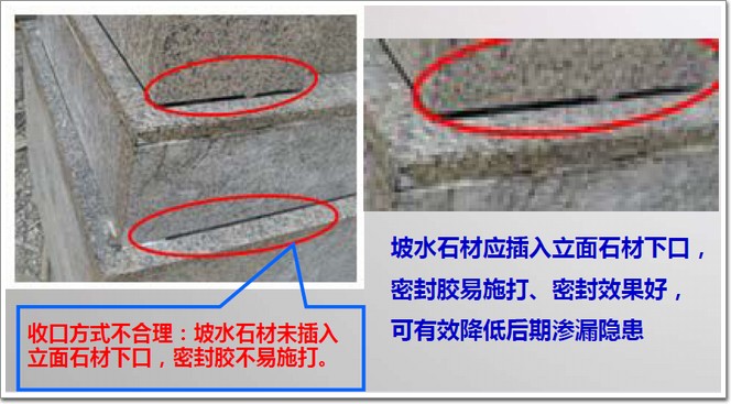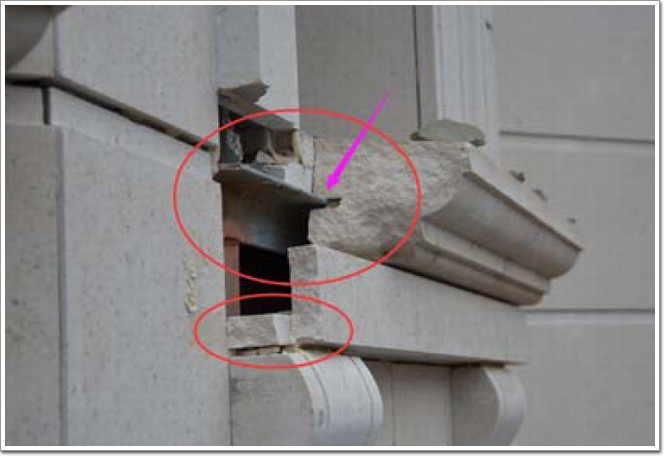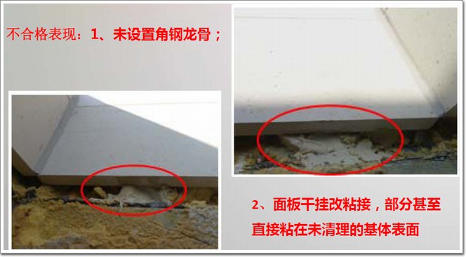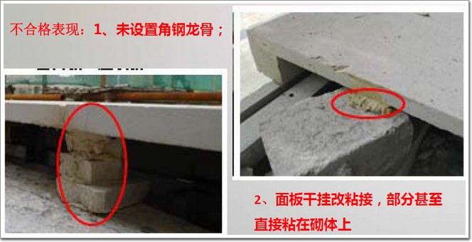 不合格表現:石材封頂板與龍骨未采用掛件連接,僅靠石材自重和膠粘結,地震作用和膠失效后,石材易脫落。
