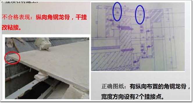 正確施工工藝:采用背栓連接,石材背面粘結防墜落筋。