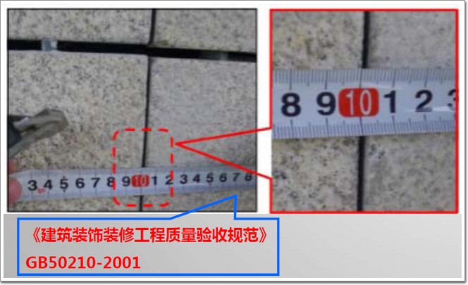 不合格表現:石材面板豎向膠縫較小僅為2mm超出誤差范圍。