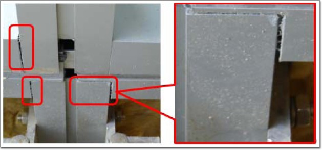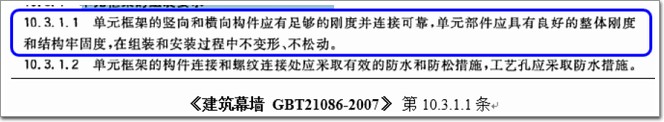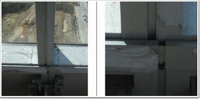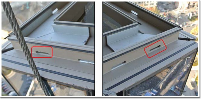 不合格表現:加工質量不合格,單元板塊橫料與豎料連接失效,膠縫被拉開。存在滲漏隱患。