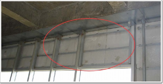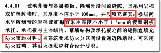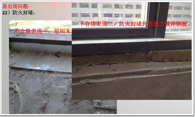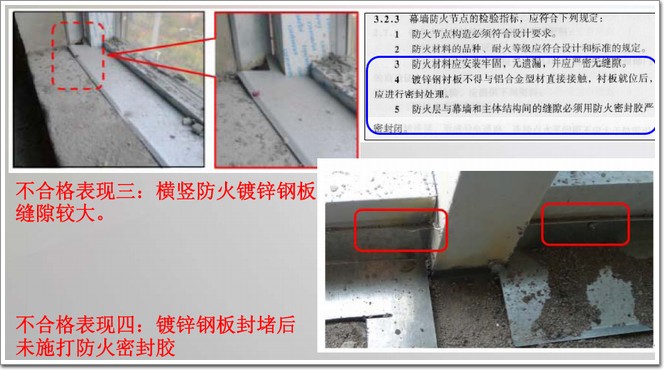 不合格表現:玻璃面板已安裝,玻璃幕墻下口防火封堵未安裝。