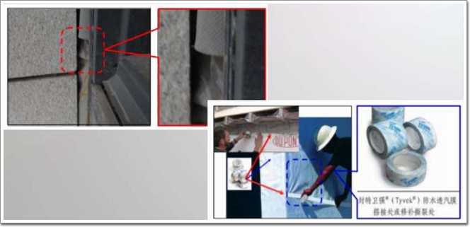 不合格表現:開縫石材背襯防水透氣膜搭接失效。