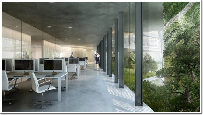 作為一個創新型的辦公建筑,其空間組織結構如同圍繞中心點展開的六個花瓣,使得集團六大品牌既有自己獨立的辦公研發空間,又可以與其它部門相互交流。有別于常見的方盒子建筑,發散型布局使得辦公空間靈活高效,并具有足夠的自然光線,通風和景觀。作為公共區域有中庭,向不同品牌的員工、客人開放,其間的天橋除作為空中的交通連接外,還可以用作時裝秀等表演空間。設立于中庭的兩個景觀電梯又將半透的辦公中廳空間在豎向上連接在一起。內部與外部環境連接,將研發中心的公共交流從室內延伸到室外花園,為員工提供輕松的氛圍和場所,同時具有很強的向心力。