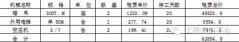 (3)停工期間機(jī)械費(fèi)的計(jì)算。有不少大型機(jī)械是施工單位從租賃站租來(lái)的,停工期間的機(jī)械費(fèi),亦可按租賃制編制。以下表為例: