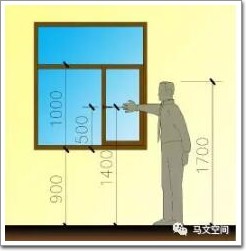需要解釋一下的是高度:我們?cè)陉P(guān)注窗戶(hù)太大的問(wèn)題的時(shí)候,常常只關(guān)注寬度,其實(shí)高度也很“致命”。對(duì)于一般的外平開(kāi)窗來(lái)說(shuō),在窗臺(tái)高度一定的情況下,窗扇越高,開(kāi)啟把手的位置也會(huì)越高,而在“伸臂→俯身”這個(gè)開(kāi)窗動(dòng)作過(guò)程中,人手所能達(dá)到的高度是呈現(xiàn)下降趨勢(shì)的。所以,窗扇太高、把手太高,會(huì)加大操作的不便。身高1.6~1.7m的普通人,手臂平伸的高度約為1.4~1.5m,按照普通窗臺(tái)0.9m高考慮,1.0~1.2m是開(kāi)啟扇的合理高度(見(jiàn)下圖)。