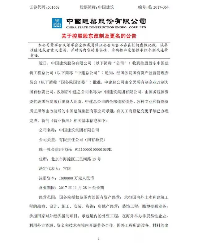以下為中國建筑股份有限公司官網(wǎng)最新對外發(fā)布的控股股東中建總公司更名公告原文:
