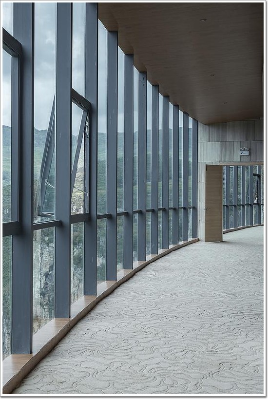建筑外立面沒有凹凸變化,或者豐富穿插,在空間上也并不追求奇巧,在設計師看來,在如此的大山大水中,在如此的奇峰絕壁上,所有的人工的小機靈都很難和大自然對抗;要想使建筑能和環境對話,最好的方法是以靜制動,以平凡、以謙遜直面百米懸崖來襯托自然造物之奇、之美。