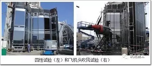 進(jìn)行了5 個(gè)幕墻足尺試件的四性試驗(yàn)和飛機(jī)頭動(dòng)風(fēng)力試驗(yàn),測試了氣滲、水滲、風(fēng)壓變形、平面內(nèi)變形、溫度循環(huán)。5 個(gè)試件的試驗(yàn)結(jié)果表明:幕墻滿足哈利法塔的要求。對設(shè)備層幕墻單獨(dú)進(jìn)行了專門的試驗(yàn)。