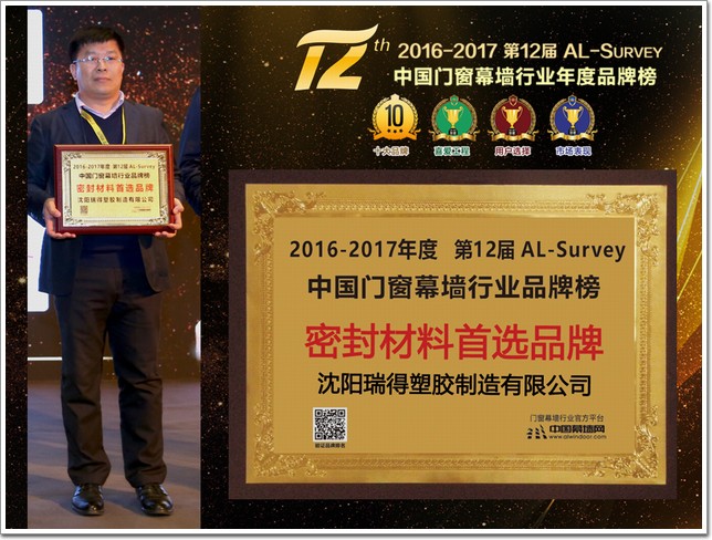 此外,在全國鋁門窗幕墻行業年會其間,還舉行了由中國建筑金屬結構協會主辦,中國幕墻網ALwindoor.com承辦的“第十二屆AL-Survey2016-2017中國幕墻網年度大型讀者調查暨‘我最喜愛幕墻工程’評選活動”的頒獎儀式,該活動自2005年創立以來,迄今已連續舉辦12屆,堅持“沒有黑馬,實至名歸”的評選風格,已成為廣大房地產開發商、設計院以及行業專家、顧問咨詢公司等讀者群體進行品牌選擇和產品選購的重要參考依據。而每屆的“我最喜愛幕墻工程”評選,更是以其“新、奇、高、大”的入圍標準,被喻為“魯班獎”的前哨站,沈陽瑞得以超高人氣,以及得來自行業專家、幕墻設計院和顧問公司20名專業評委超高評價,最終獲得密封材料首選品牌第二名,這是“沈陽瑞得”的實力見證,更是“沈陽瑞得”回饋客戶信任的最好成績單。