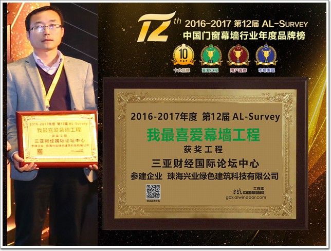 2017年3月10日,由中國(guó)建筑金屬結(jié)構(gòu)協(xié)會(huì)主辦,中國(guó)幕墻網(wǎng)承辦的第12屆AL-Survey 2016-2017年度大型讀者調(diào)查活動(dòng)暨“我最喜愛幕墻工程”評(píng)選活動(dòng)(簡(jiǎn)稱:AL-Survey)頒獎(jiǎng)儀式在廣州富力君悅大酒店隆重舉行,由珠海興業(yè)承建的三亞財(cái)經(jīng)國(guó)際論壇中心項(xiàng)目自2016年9月開始征集本次活動(dòng)以來,備受業(yè)界關(guān)注,在歷經(jīng)半年的層層篩選后,該項(xiàng)目成功入圍第12屆AL-Survey 2016-2017年度 “我最喜愛幕墻工程”類獎(jiǎng)項(xiàng),并最終以43912的高票數(shù)獲得“我最喜愛幕墻工程”大獎(jiǎng)。