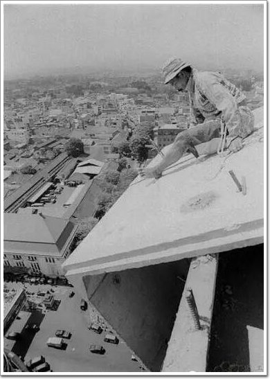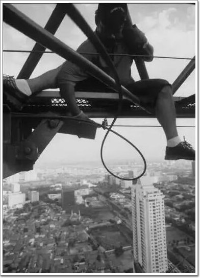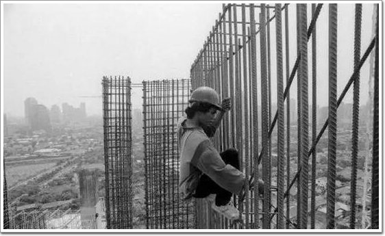 人爬在鋼筋之上,兩腳只是踩著細細的鋼筋,身體的重量都在左手上。